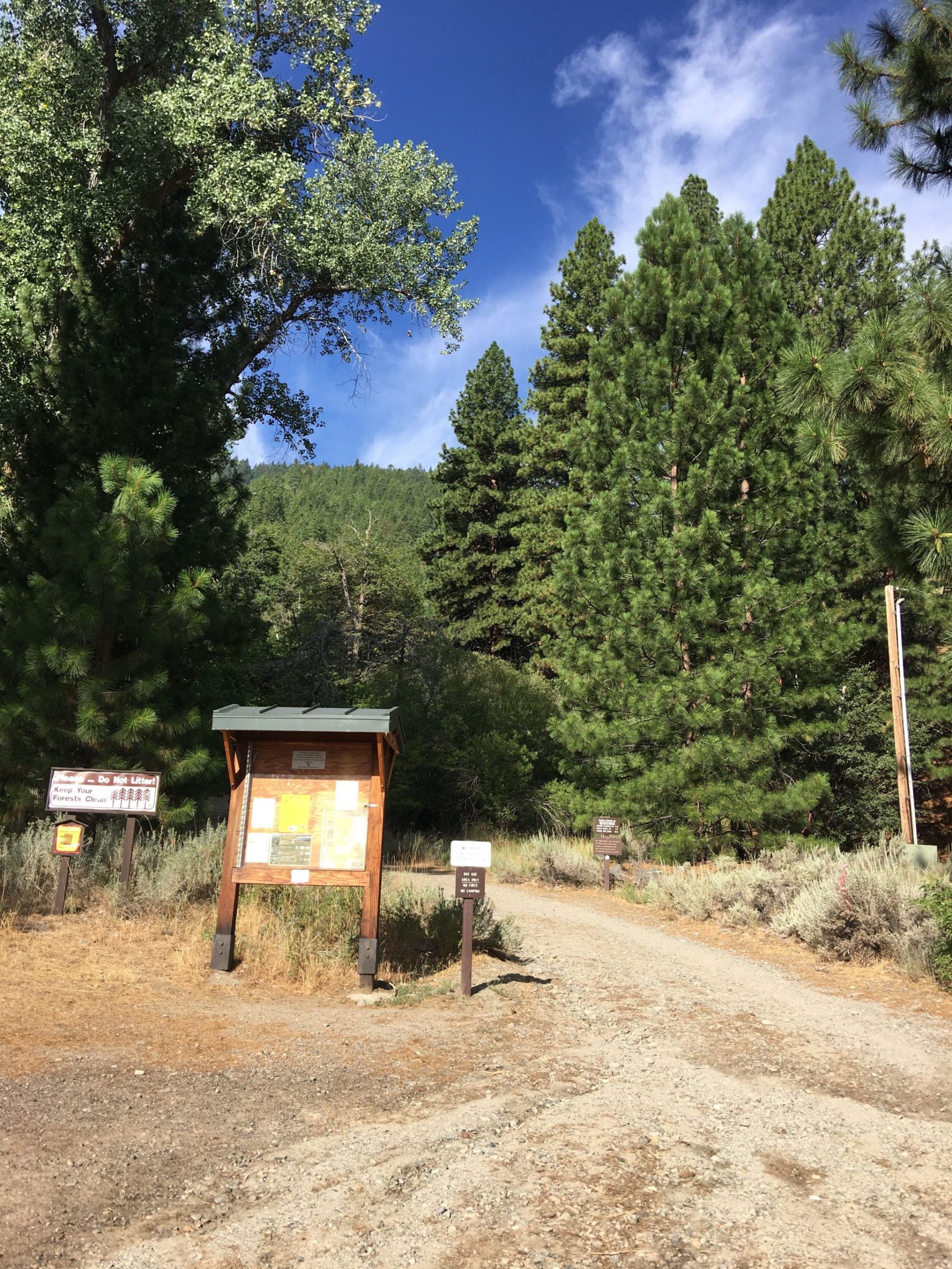 村はほぼ見終わったので、Genoa Bar and Saloonから南へすぐのCarson Streetを山側へ行くと道の終わりにGenoa Canyon Trailheadがあり、ここから里山ハイキングへ。村の北端へつながるGenoa Loop Trailは全長約8.2マイル(約13km) もあるので、行けるとこまで行って、出来れば1時間半くらいで見られる滝を見てから引き返そうというプランで歩き始めました。10分程で小さな滝というか渓流を見て涼んだ後、さらに山道をすすんでいくほどにスイッチバック度が増し、そして道幅が狭い上に片側切り落としで心臓バクバク。軽い気持ちの里山散歩には向かなかったなーと30分でUターンしました。ジュノアとカーソンバレーが見渡せるくらいには登ったのでとりあえずよし!としました。次回は装備と気持ちを万端にして先にある本命滝を拝みに行きたいものです。尚、Trailheadには4~5台のスペースの駐車場(無料)がありました。