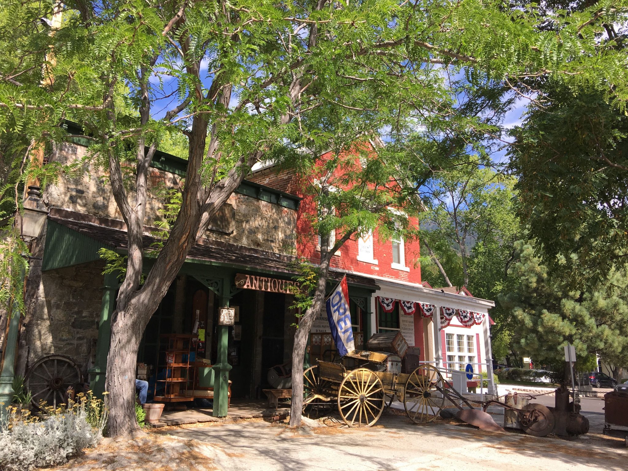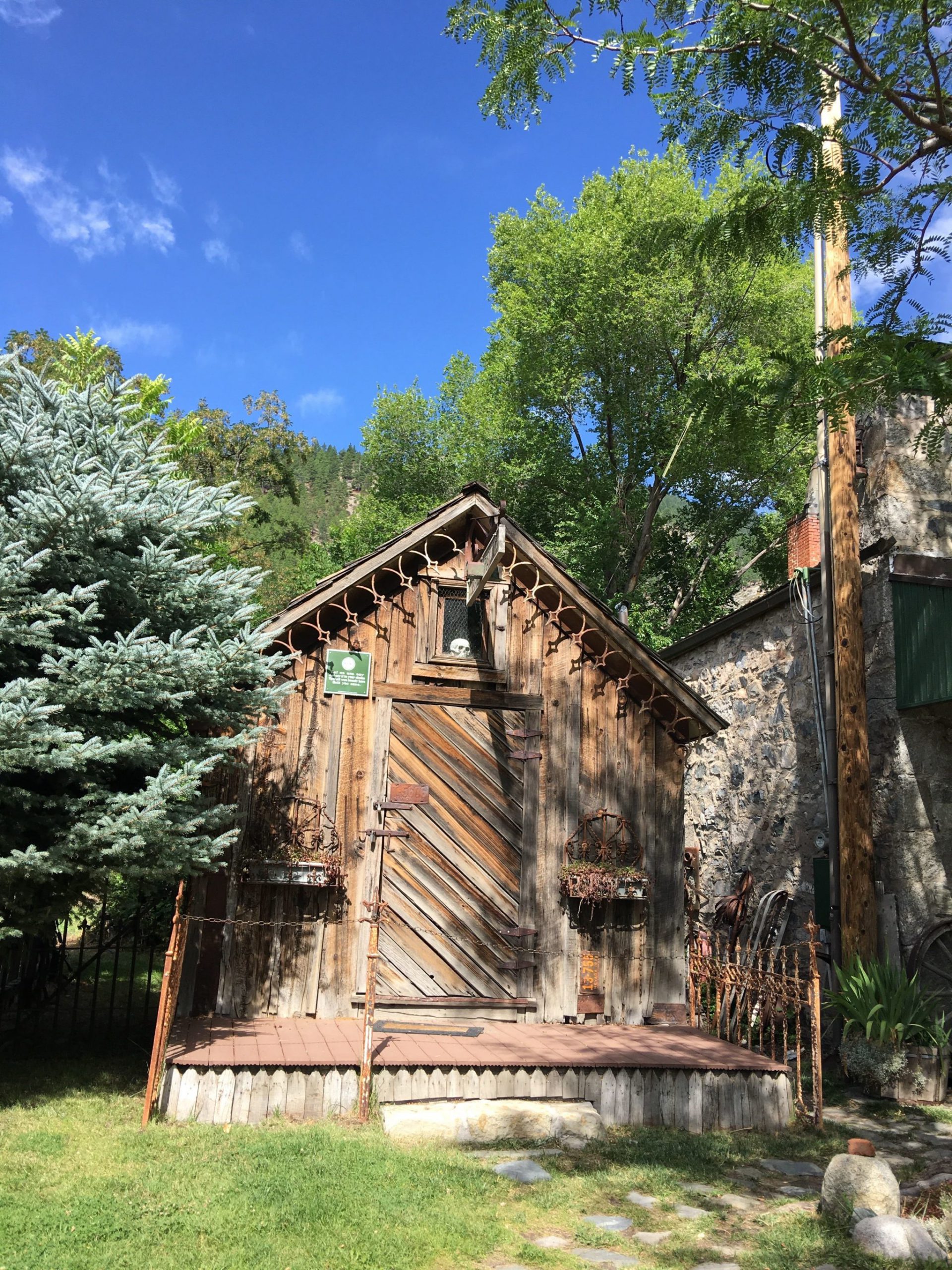 Genoa Country Innのから道をはさんで南(メインストリートの西側)の赤い建物はフリーメイソン組織の社交場(1868年~現在)でDouglas Lodgeと呼ばれてます。隣は骨董屋さん、その隣は窓に骸骨がしつらえてある廃屋系な古い小屋が・・・。