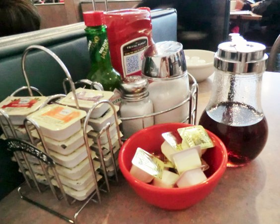 入口で座って待ってる人がいたので「あー、やっぱり待ちか~」とおもったら丁度空席が出来、待たずに席へ(ほっ)。待ってた人は多人数だったみたいでした。店内はお洒落でもなく普通のダイナー、どっちかというと正直垢ぬけてないインテリアですが、それでもお客さんが絶えない人気店で、店内はお客さんでムンムンに混んでるのは、ひとえに食事が美味しいに違いありません。期待がずんずん高鳴ります。